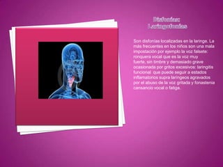 Trastornos de la fonación - Enfermedades de la laringe ... Trastornos de la fonación 1. Disfonía funcional 1) Disfonía hiperfuncional: relacionada con la sobrecarga de la voz y con laringitis frecuentes (voz ronca, áspera). Entre todas las complicaciones destacan los nódulos vocales (también llamados nódulos de los cantantes).