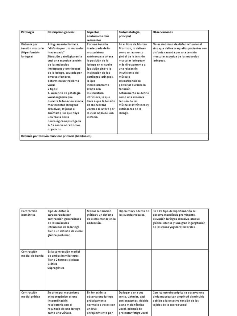 Trastornos de la voz | Farmacia Profesional - Elsevier Los trastornos de la voz constituyen el principal motivo de consulta en las unidades de foniatría, siendo los más frecuentes los siguientes. Afonía. La afonía se define como la pérdida total de la voz y su origen puede ser físico, como un traumatismo, o psíquico (por ejemplo, un cuadro histérico). Disfonía. Disfonía y trastorno de fonación - hno-rosenthal.de Disfonía y trastorno de fonación. Afonía, fallo de la voz o un sonido de la voz alterado con voz quebradiza o necesidad de carraspear tienen que ser tratados lo más rapidamente posible. Las causas pueden ser hormonales, orgánicas, psíquicas o funcionales (en profesiones que requieren hablar). Estudio clínico de la fonación - ScienceDirect Puede tratarse de una sensación difusa de un esfuerzo muscular anormal o de una impresión de disnea durante la fonación. El paciente también refiere alteraciones de otras funciones: posibles trastornos de la deglución (p. ej., en el caso de las parálisis unilaterales de la laringe) y trastornos del habla (disartrias). Trastornos de la voz: MedlinePlus en español Otras causas de trastornos de la voz incluyen infecciones, subida de los ácidos gástricos hacia la garganta, crecimientos por un virus, cáncer y enfermedades que paralizan las cuerdas vocales. Las señales que la voz no está saludable incluyen: Su voz se ha vuelto ronca o rasgada Ha perdido la habilidad de lograr algunas notas altas cuando canta